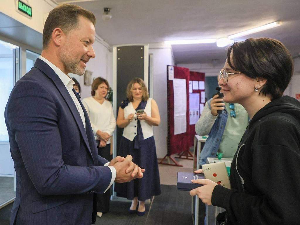 Был рад видеть на участке 18-летнюю Ульяну Бортник — она впервые сегодня проголосовала. Трогательный момент. Подарил ей небольшой сувенир от Законодательного собрания и поздравил с первым осознанным шагом гражданина.